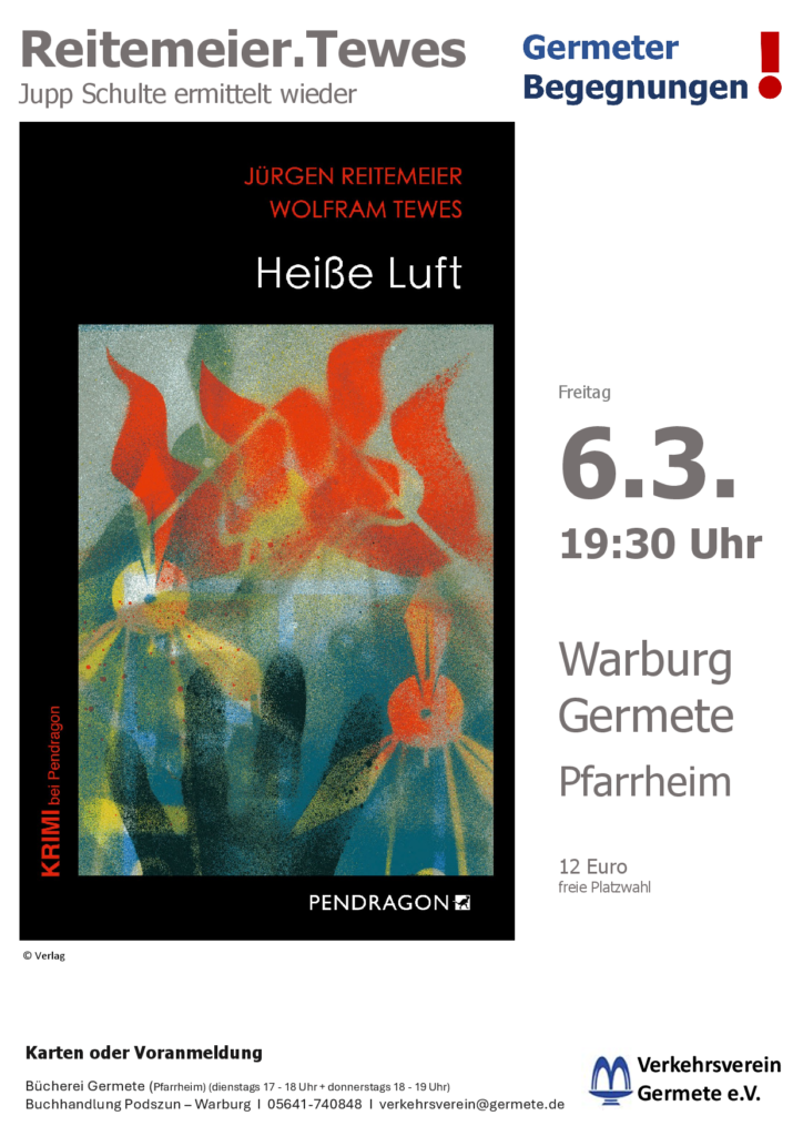Am Freitag, 6. März, gibt es „Heiße Luft“ im Germeter Pfarrheim. Im Rahmen der Germeter Begegnungen sind die in der Region bekannten Autoren Jürgen Reitemeier und Wolfram Tewes