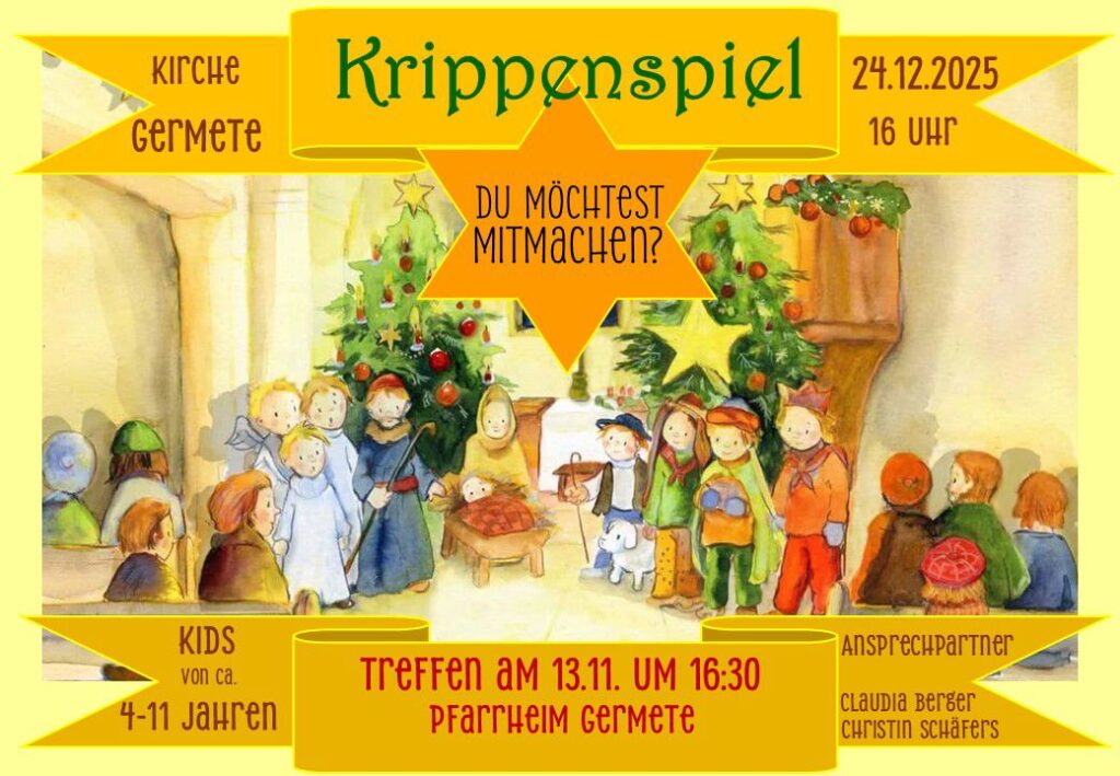 Für das diesjährige Krippenspiel, welches am 24.12.25 um 16 Uhr in der Germeter Kirche aufgeführt wird, werden noch Akteure gesucht. Die Kinder sollten zwischen 4 und 11 Jahren alt sein.