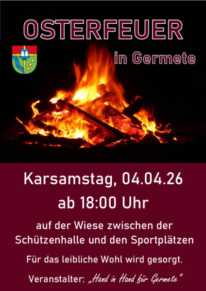 Der Verkehrsverein und die Gruppe „Hand in Hand“ laden auch dieses Jahr am Ostersamstag wieder zu einem Osterfeuer hinter der Schützenhalle ein.