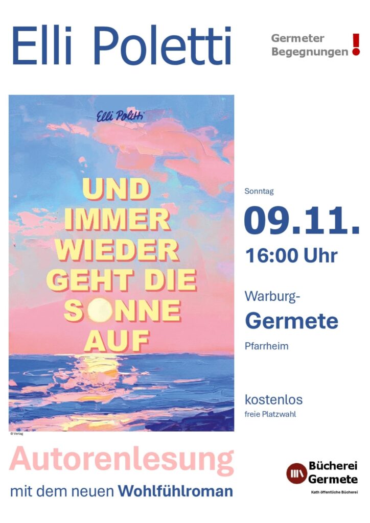 Im Rahmen der Germeter Begegnungen kommt die in Brenkhausen geborene Autorin Elli Poletti mit ihrem neuen Roman am Sonntag, 9. November, nach Germete. Beim Büchereitag liest sie im Pfarrheim ab 16:00 Uhr aus ihrem neuen Buch „Und immer wieder geht die Sonne auf“. Elli Poletti hat einen berührenden Wohlfühlroman geschrieben, über Liebe, Lebensfreude, Neuanfang und den Mut, dem Leben wieder zu vertrauen. Für alle, die Geschichten über zweite Chancen, Fernweh und das kleine Glück lieben. Die Besucher können der Autorin bei Kaffee und Kuchen lauschen und natürlich – wie immer bei den Germeter Begegnungen – anschließend ins Gespräch kommen. Der Eintritt ist frei.