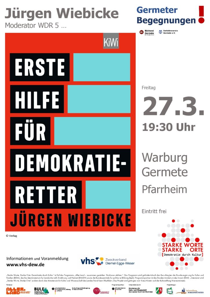 In Zusammenarbeit von VHS Diemel-Egge-Weser und „Germeter Begegnungen“ kommt der Radiomoderator und Schriftsteller Jürgen Wiebicke am Freitag, 27. März, ins Pfarrheim. Im Mittelpunkt der Veranstaltung, die um 19:30 Uhr beginnt, steht sein Buch „Erste Hilfe für Demokratie-Retter“.